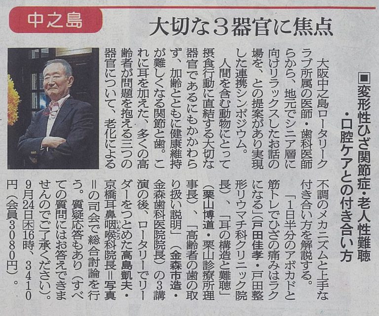 2020年9月24日(木)に大阪中之島RC・朝日カルチャーセンターの連携シンポジウム「変形性ひざ関節症・老人性難聴・口腔ケアとの付き合い方」を開催いたします。