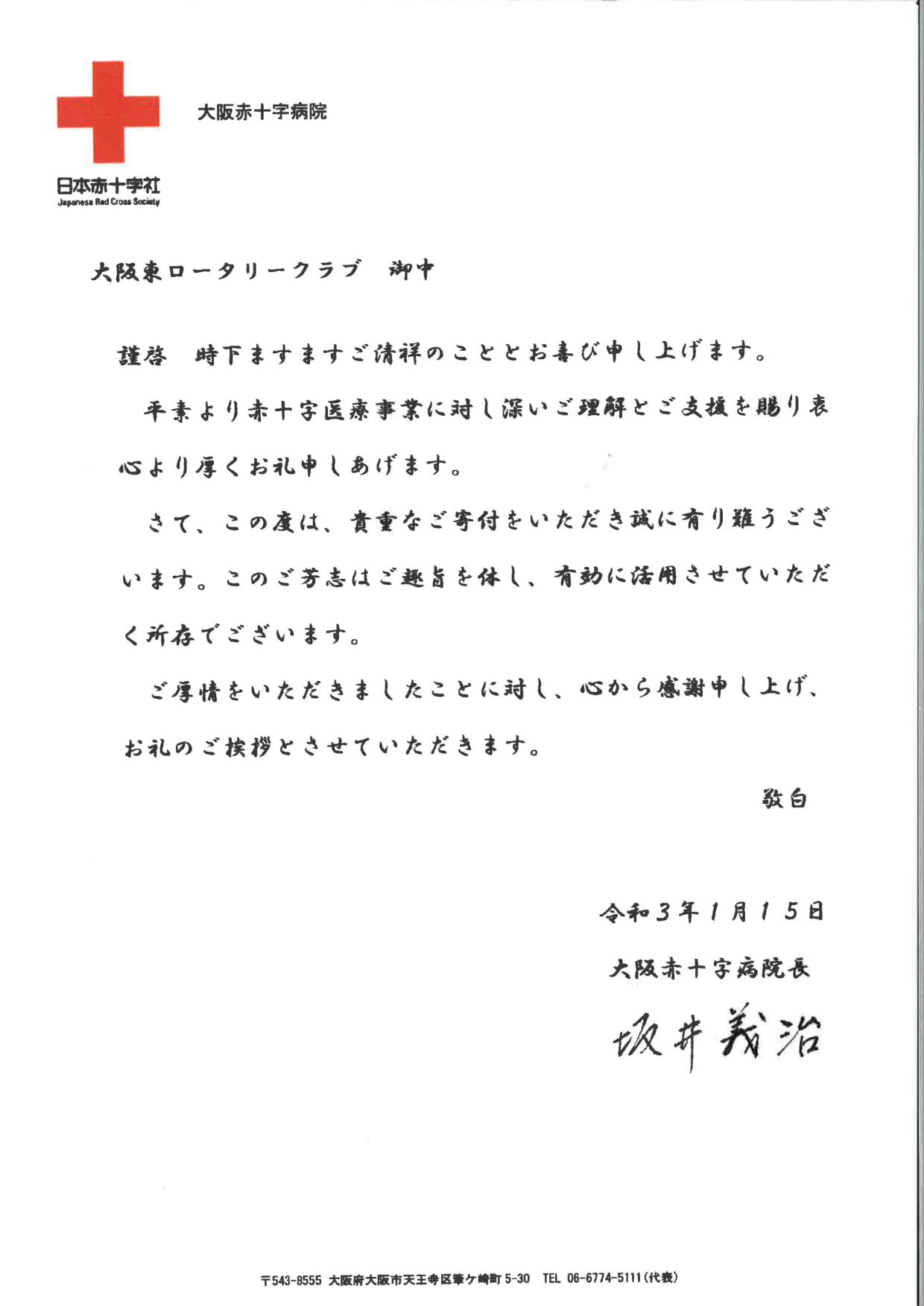 昨年度、当クラブでは会員に寄付をお願いして新型コロナウイルス対策支援基金を創設し、医療関係、困窮している留学生達への寄付支援を実施して参りました。昨年末より第3波の感染拡大が懸念され、特に医療物資関係がひっ迫しているといわれております。そこで、新型コロナウイルス対策支援基金の寄付先として、かねてよりご縁があった大阪市内の基幹病院である大阪赤十字病院を選び、先方にお伺いをかけたところ基金の趣旨である「コロナウイルス対策」のためにお役立ていただけるということでしたので、寄付の運びとなりました。