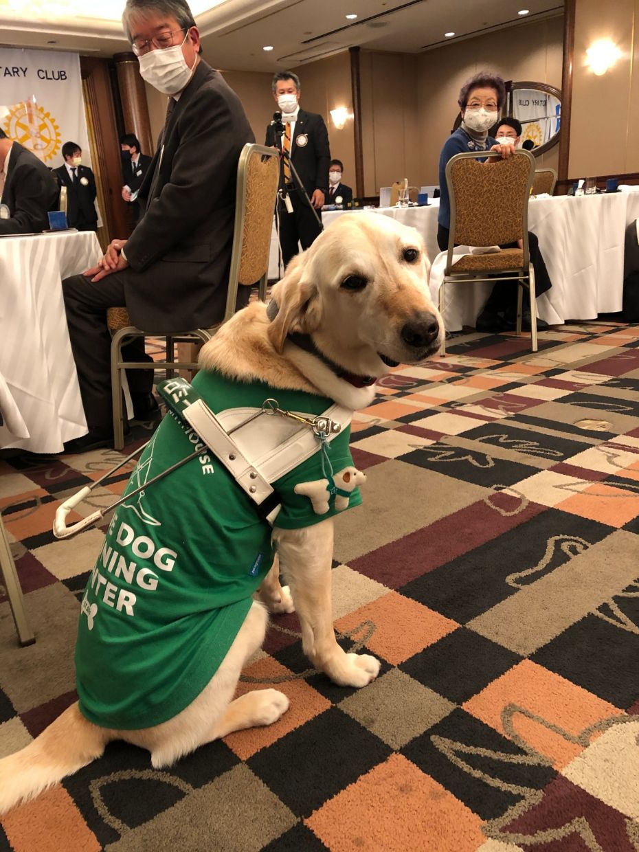 今年は、コロナ禍により街頭での青少年による募金活動が中止となったため、日本ライトハウス様から盲導犬とともに担当者にお越しいただき、例会で訓練方法などについて講話をしていただきました。