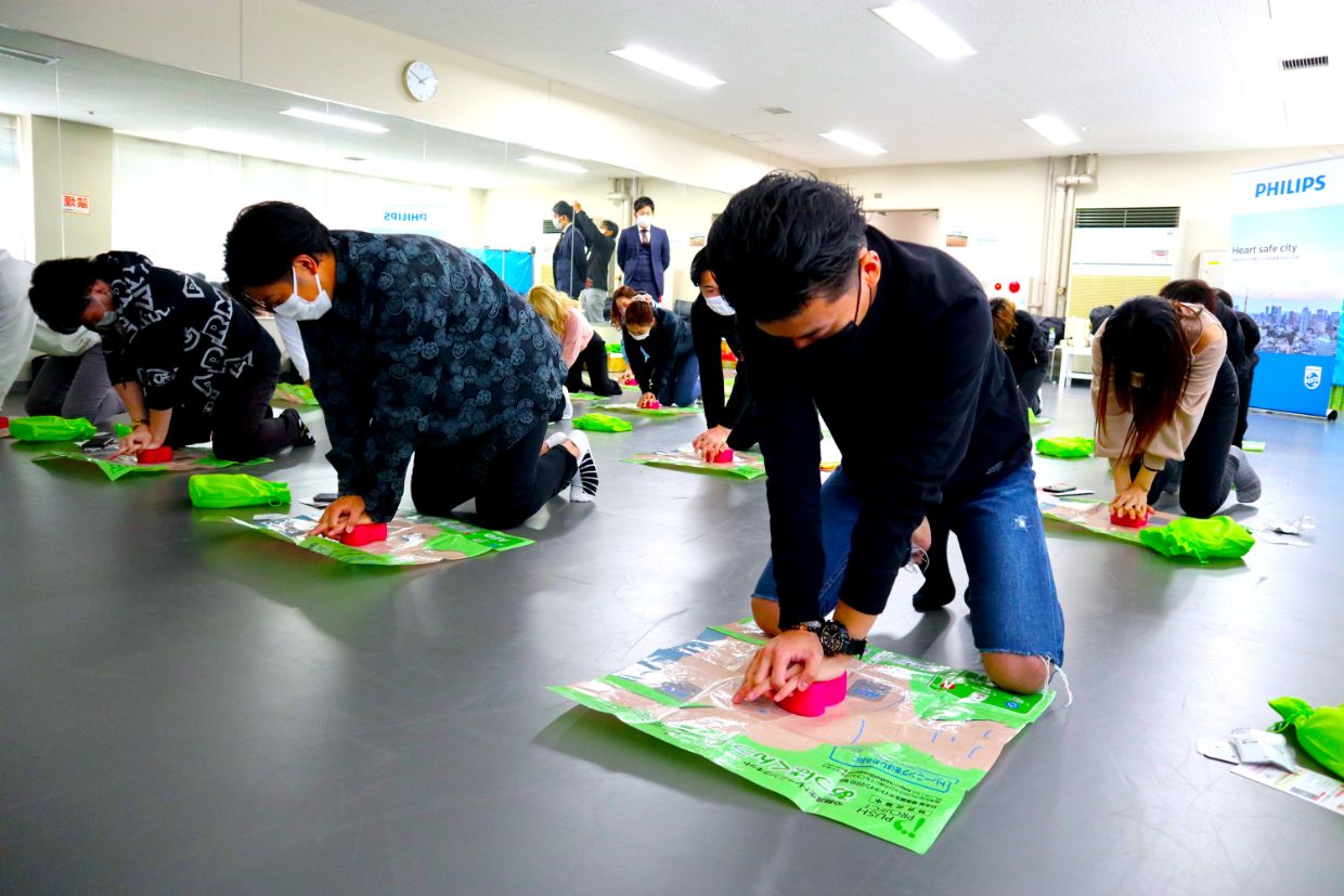 今回の実証実験では、まず、大阪難波RACの参加メンバーに、AED講習会を実施して頂きました。