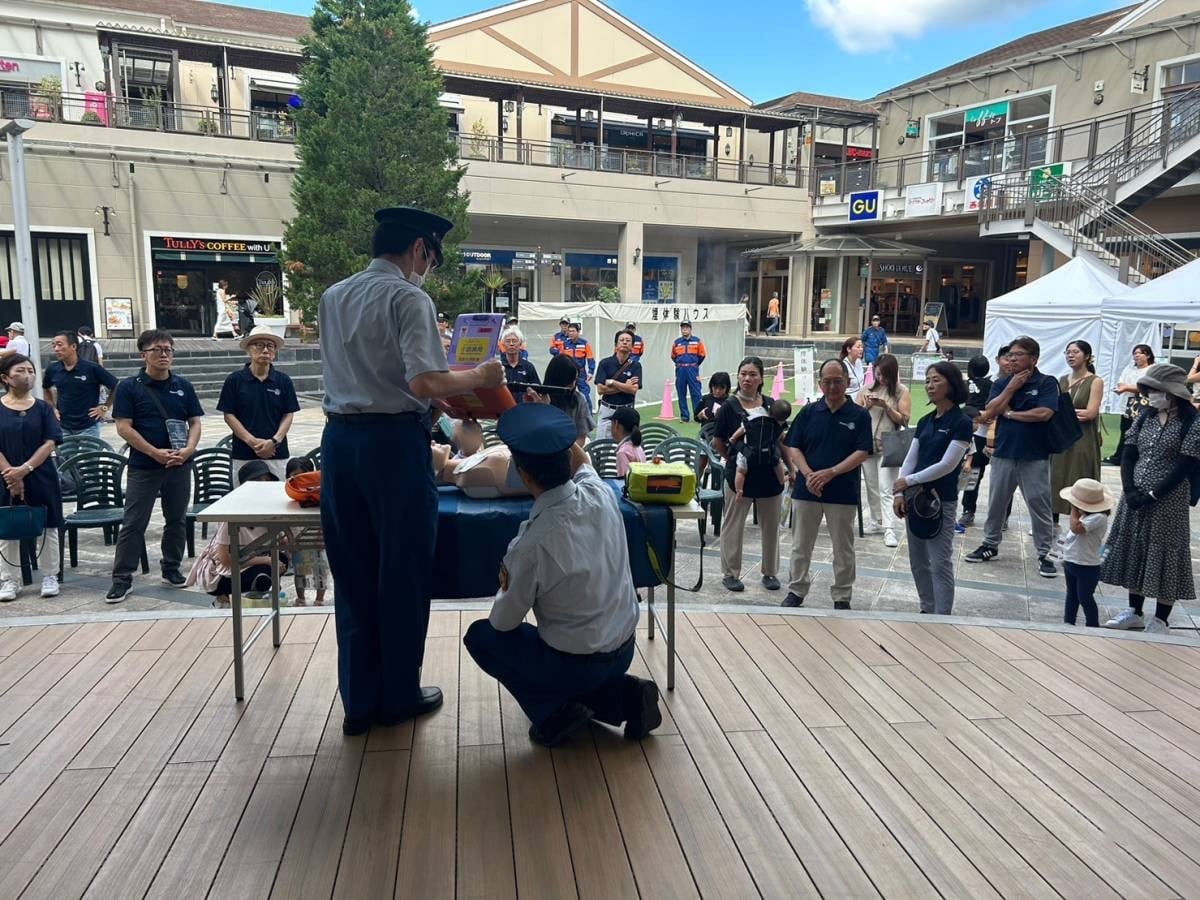 それに先立ち9月18日(月・祝)に、みのおキューズモールショッピングセンター内広場にて箕面市長ご臨席の下、「AEDの寄贈式と公開講習会」を実施しました。