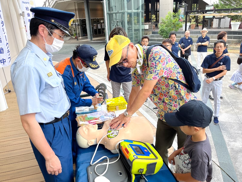 箕面市消防本部のご協力ご指導による「AED公開講習会」には、会員とその家族に加えて、多くの一般のご家族が参加し、心臓マッサージの方法とAEDの使い方を学び、特に子供たちが熱心に取り組む姿が印象的でした。