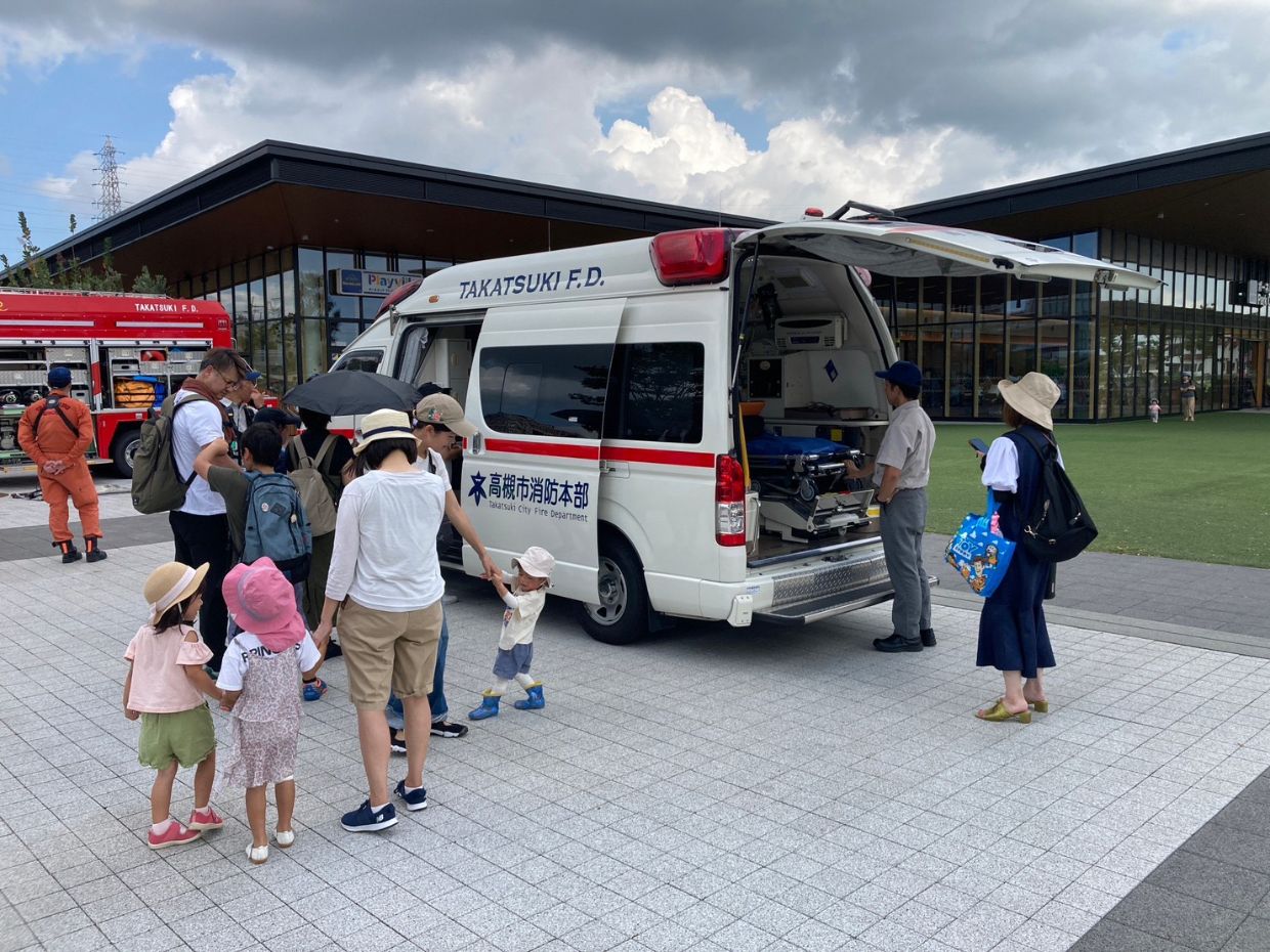 室内では、高槻市による「自助・共助・公助について」のセミナーを開催。後半には「防災グッズの作り方講座」「救命救急実践講座」を実施。屋外の広場では、「車両展示」「消火訓練」「土嚢積み体験」を企画。総来場者数は約600名、また多くの子供たちが興味津々に参加してくれました。