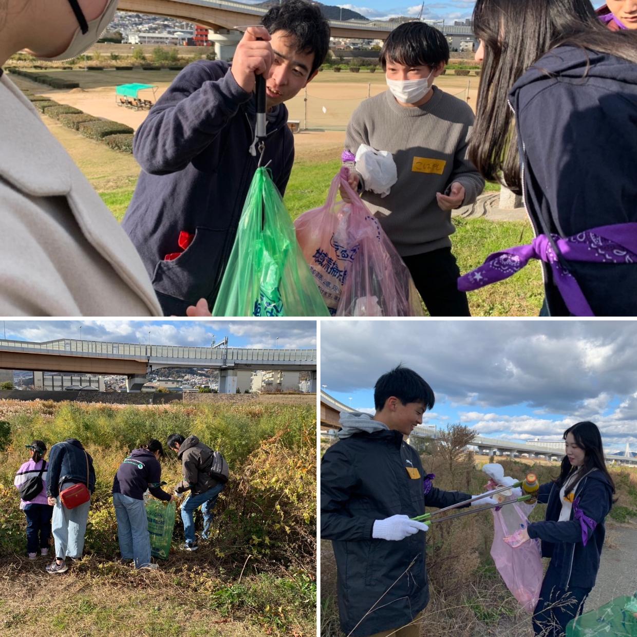 その後、11名~13名を1つのチームとして、6チームで猪名川河川敷に向かい、ゴミひろいを行いました。大阪大学GECS考案のビンゴシートをもとに、どんなゴミが落ちているかを確認。途中では河川の傍まで行って透明度や生物がいるかなどを観察しました。この日回収したゴミは、燃えるゴミ9.67㎏、燃えないゴミ7.2㎏、その他にポリタンク、道路のラバーポール、テストの回答用紙なども発見されました。