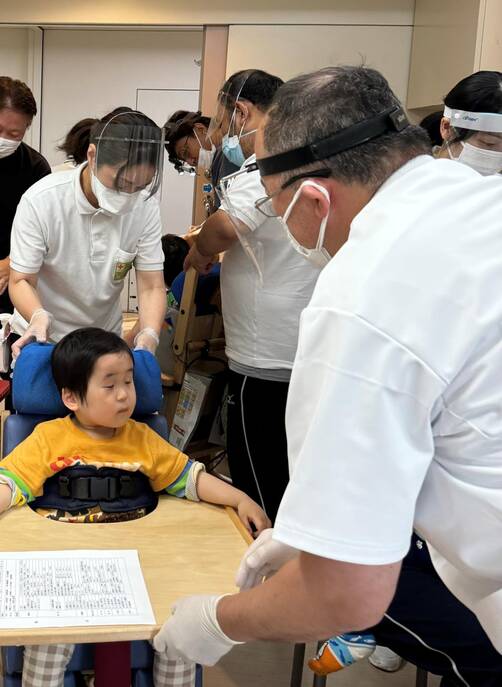 32名の歯科検診者は、重症者では自発呼吸が出来なくて気管挿管されている子どもから、車いすで移動可能な子どもまでいます。検診の結果、9名は歯科治療が必要であり、2名は要抜歯、あとの7名は歯石除去、虫歯の治療、マウスガードの必要な子どもで、歯科治療先へ搬送して治療を受けることとなりました。
