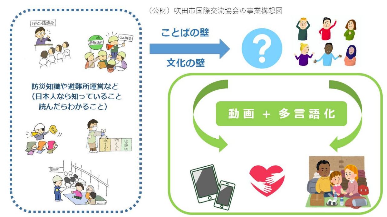 災害時に地域住民がお互い協力し合う地域づくりのためにも避難方法や避難場所での過ごし方等わかりやすい動画を作成し多言語で発信することができないか、と考えています。