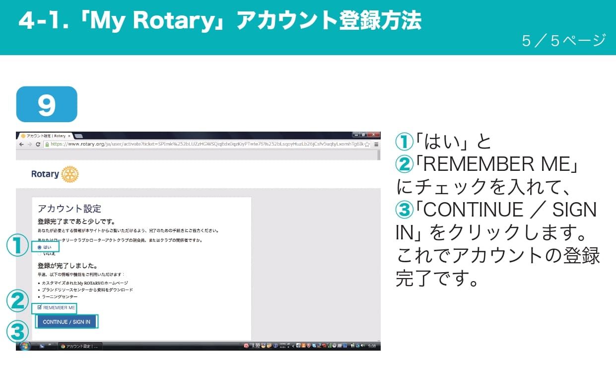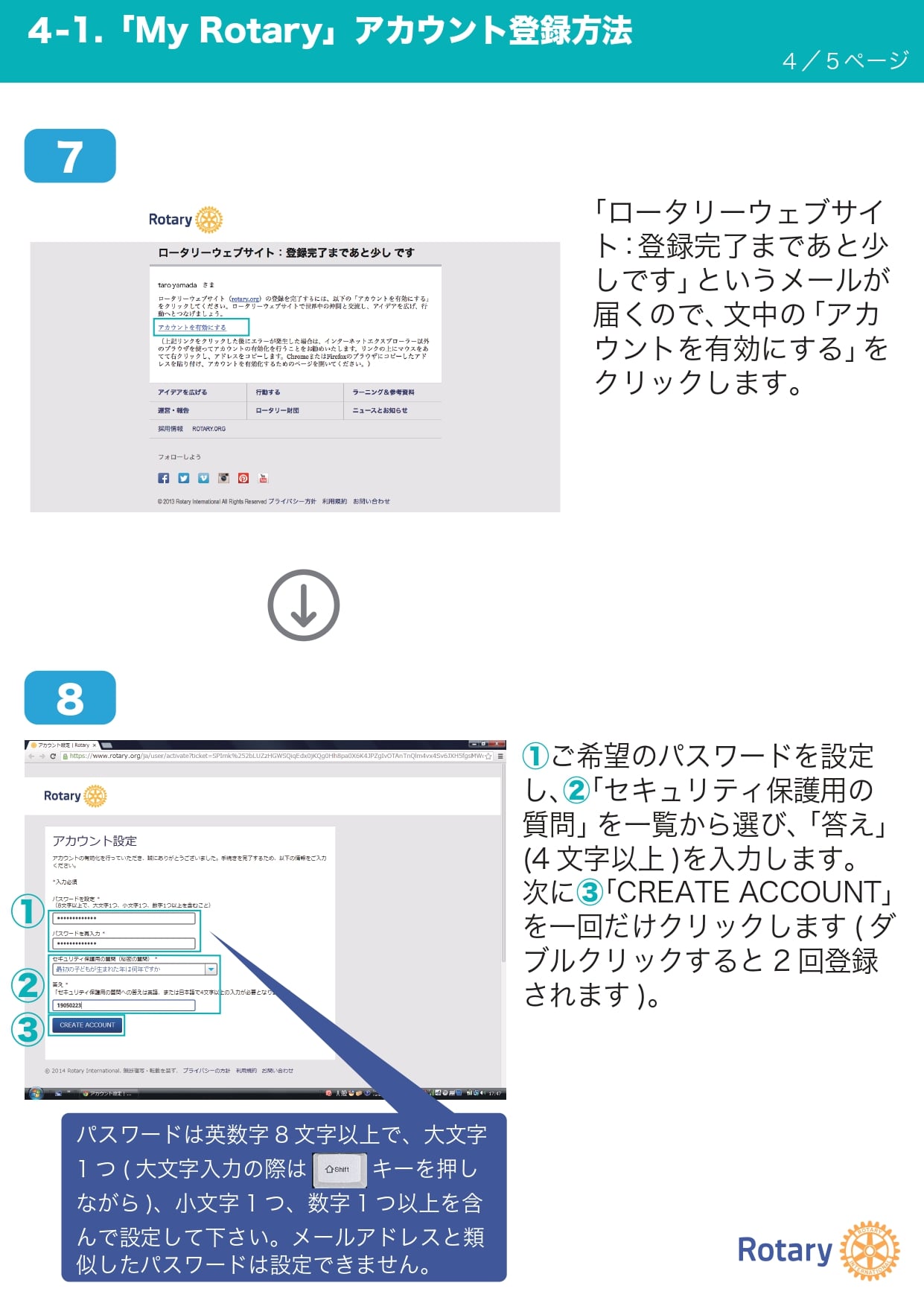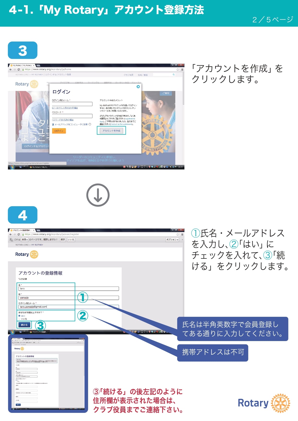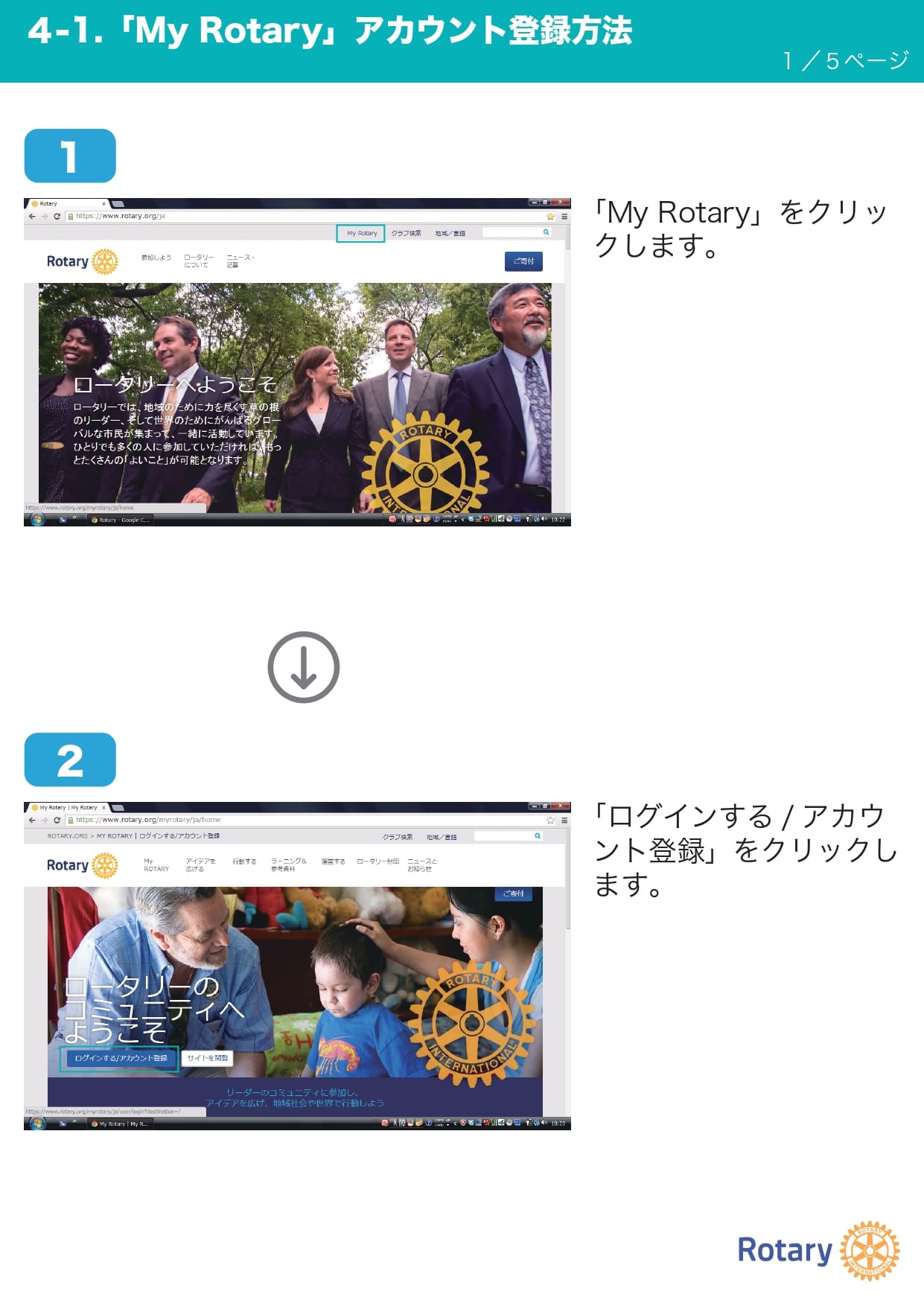 登録方法 マイロータリー登録方法 こちらをクリック→ https://www.rotary.org/ja 参考資料 マイロータリー登録方法(PDF) My Rotary 操作マニュアル一覧(Excel) My Rotaryアカウント登録 不具合事例集(Excel) 【別紙】クッキークリア手順(PDF) My Rotaryアカウント作成方法(日本事務局)(PDF)